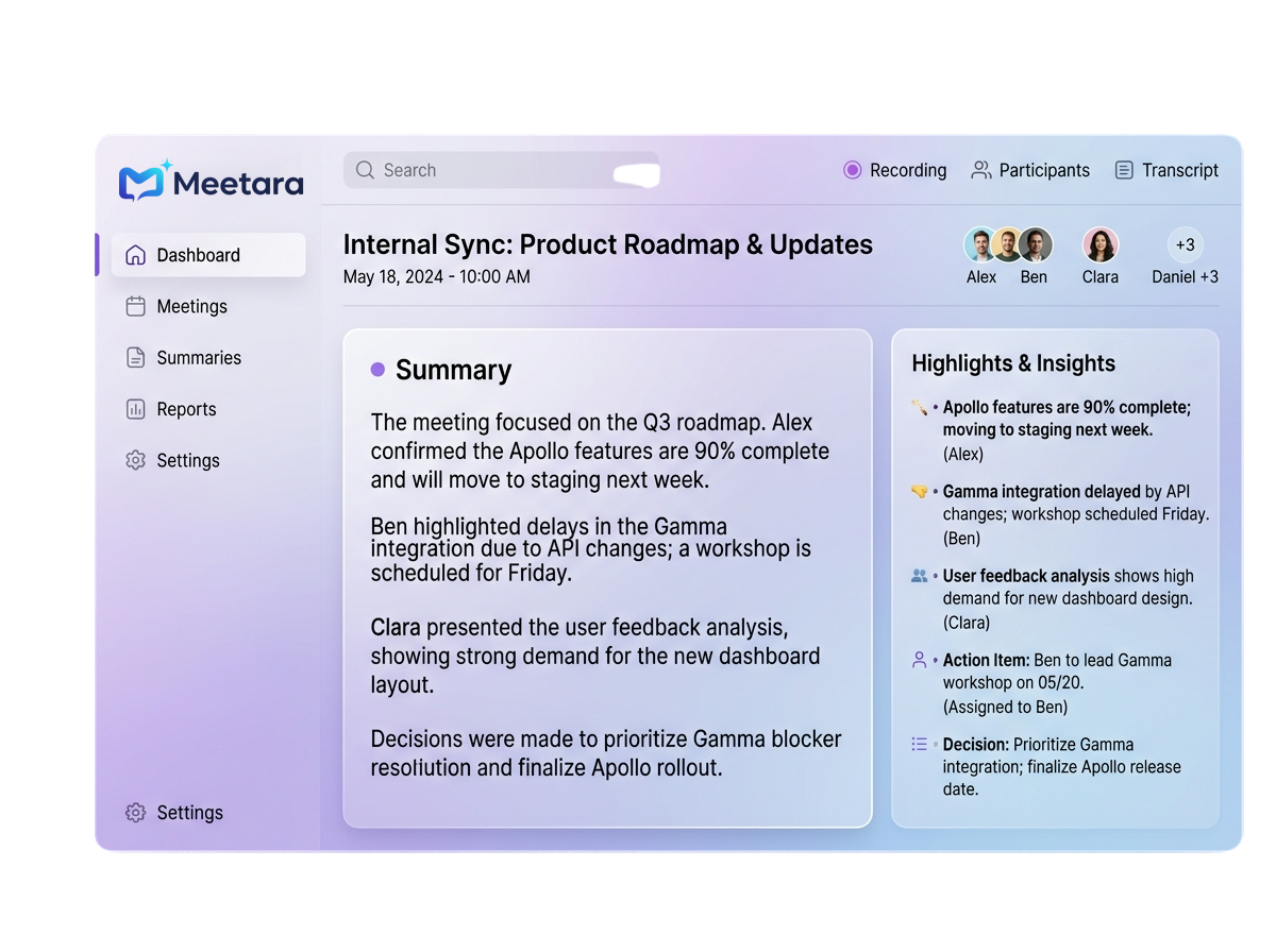 Instantly receive AI-generated summaries, key highlights, and action items so your team can focus on decisions instead of note-taking.